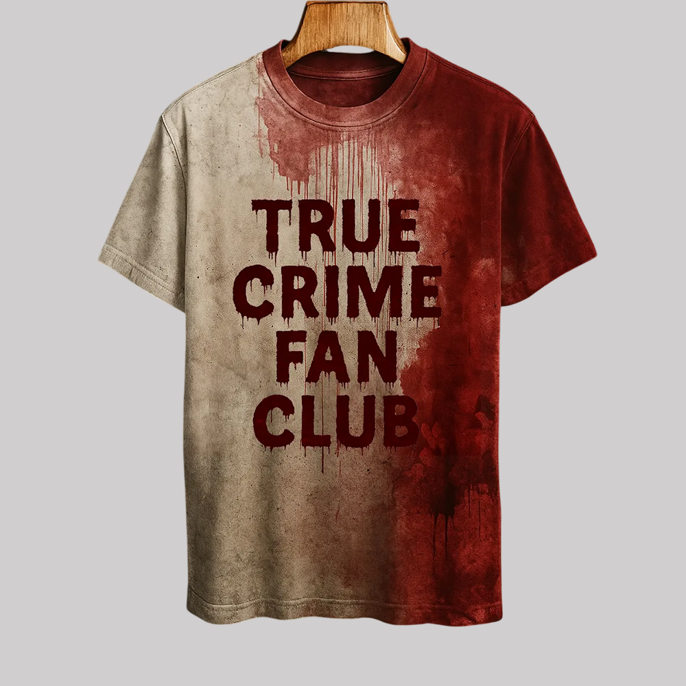 Unlike ordinary Halloween shirts, this one goes far beyond pumpkins or skeleton graphics. With its blood-drip effect and bold “TRUE CRIME FAN CLUB” lettering, it becomes instantly recognizable and conversation-worthy. Half classic beige, half deep blood red, the shirt radiates a gritty, cinematic vibe—perfect for fans who want their outfit to reflect their obsession with mysteries, crime scenes, and chilling unsolved cases.