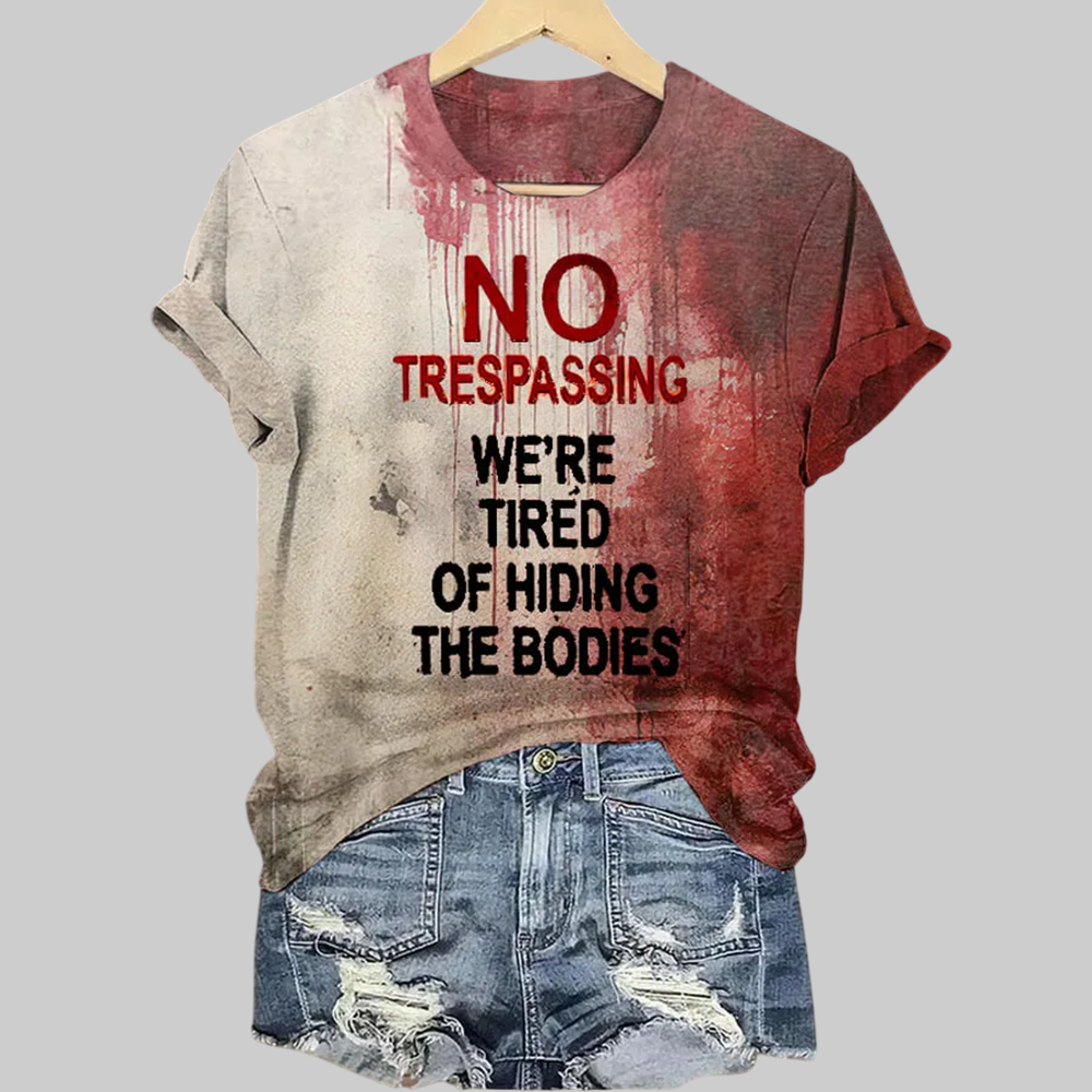 2025 Halloween Women's No Trespassing We Are Tired of Hiding the Bodies Printed Casual T-Shirt – We’re Tired of Hiding the Bodies” Quote
