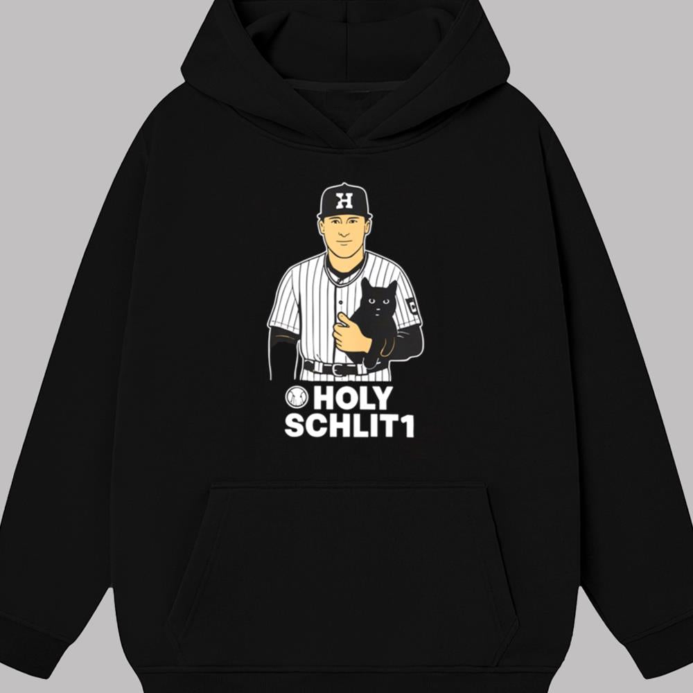 Step into the 2025 season with a shirt that combines baseball fandom, humor, and collectible appeal – the Brewers King Andrew Vaughn Shirt Giveaway 2025. Featuring a bold illustration of Andrew Vaughn in a classic pinstripe uniform, holding a sleek black cat, along with the witty caption HOLY SCHLIT1, this shirt serves as both a conversation starter and a proud declaration of team loyalty.