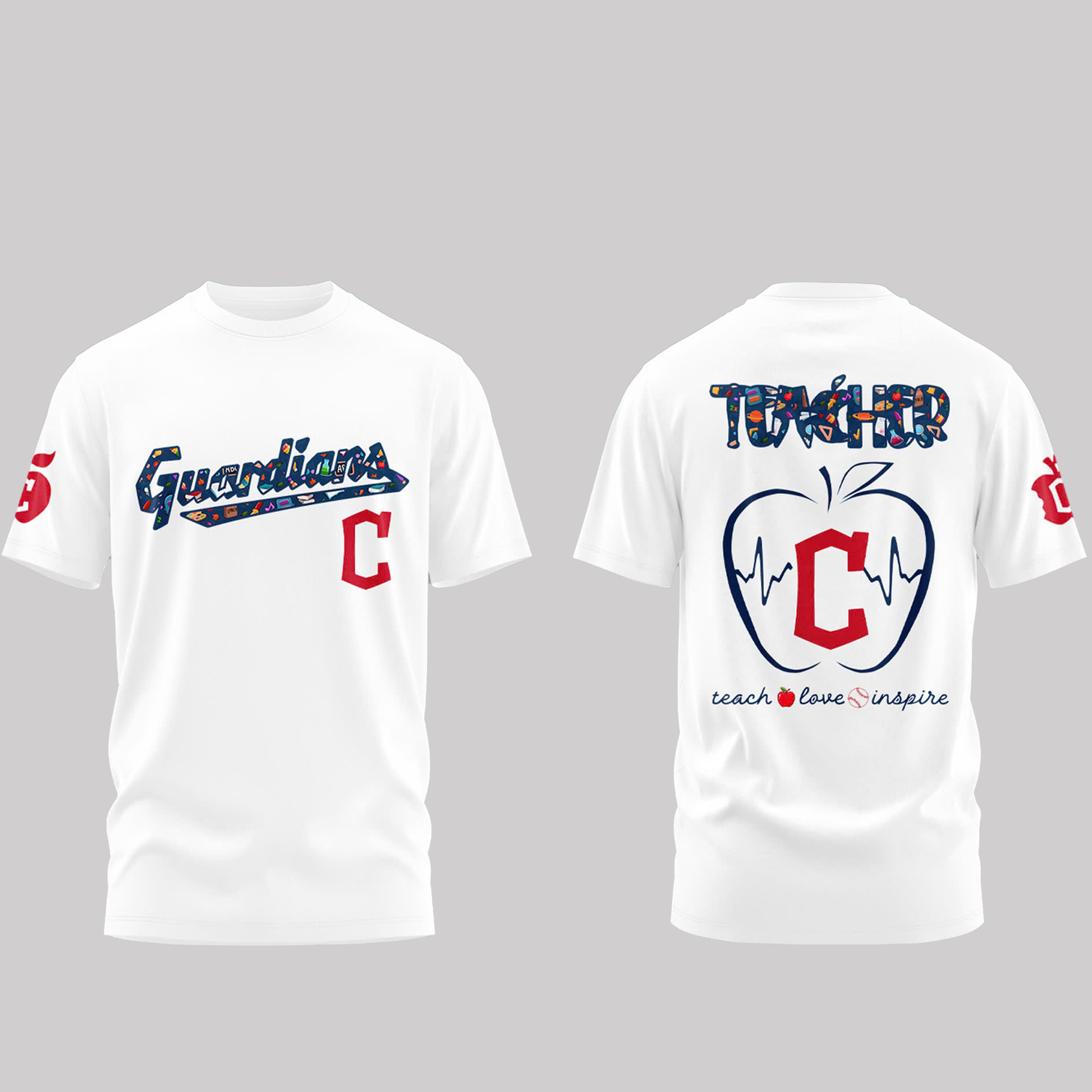 The back of the hoodie features a bold apple with the team’s signature “C” and heartbeat, symbolizing the dedication of teachers who bring learning to life. The word “TEACHER” is highlighted on the top with Guardians-inspired graphic details, while the phrase “teach ♥ love ♥ inspire” completes the design.