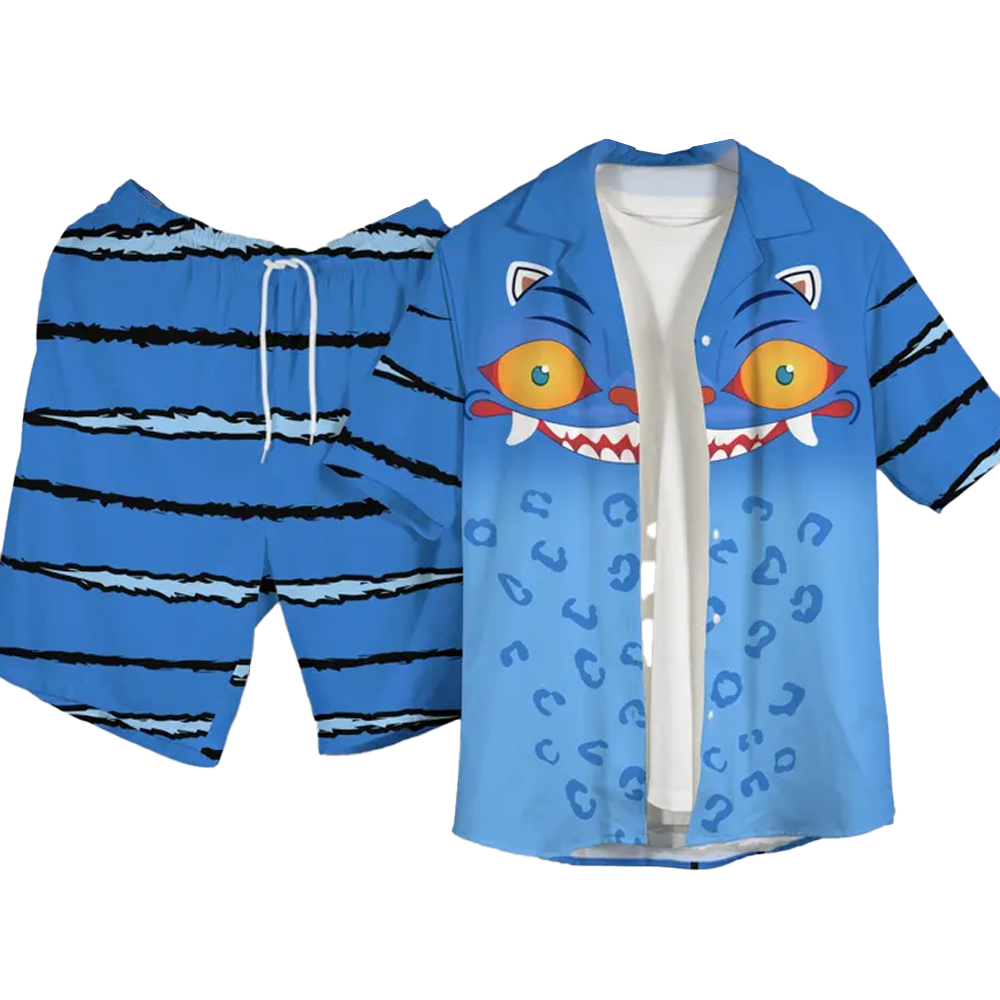 Bring life into your wardrobe with the Derpy Tiger Hawaiian Shirt, a bold, playful and eye-catching outfit that combines tropical style with a unique street energy. Designed for those who love to express themselves, this shirt and shorts set combines a vibrant blue color scheme, black tiger stripes and a unique tiger face design that instantly grabs attention.