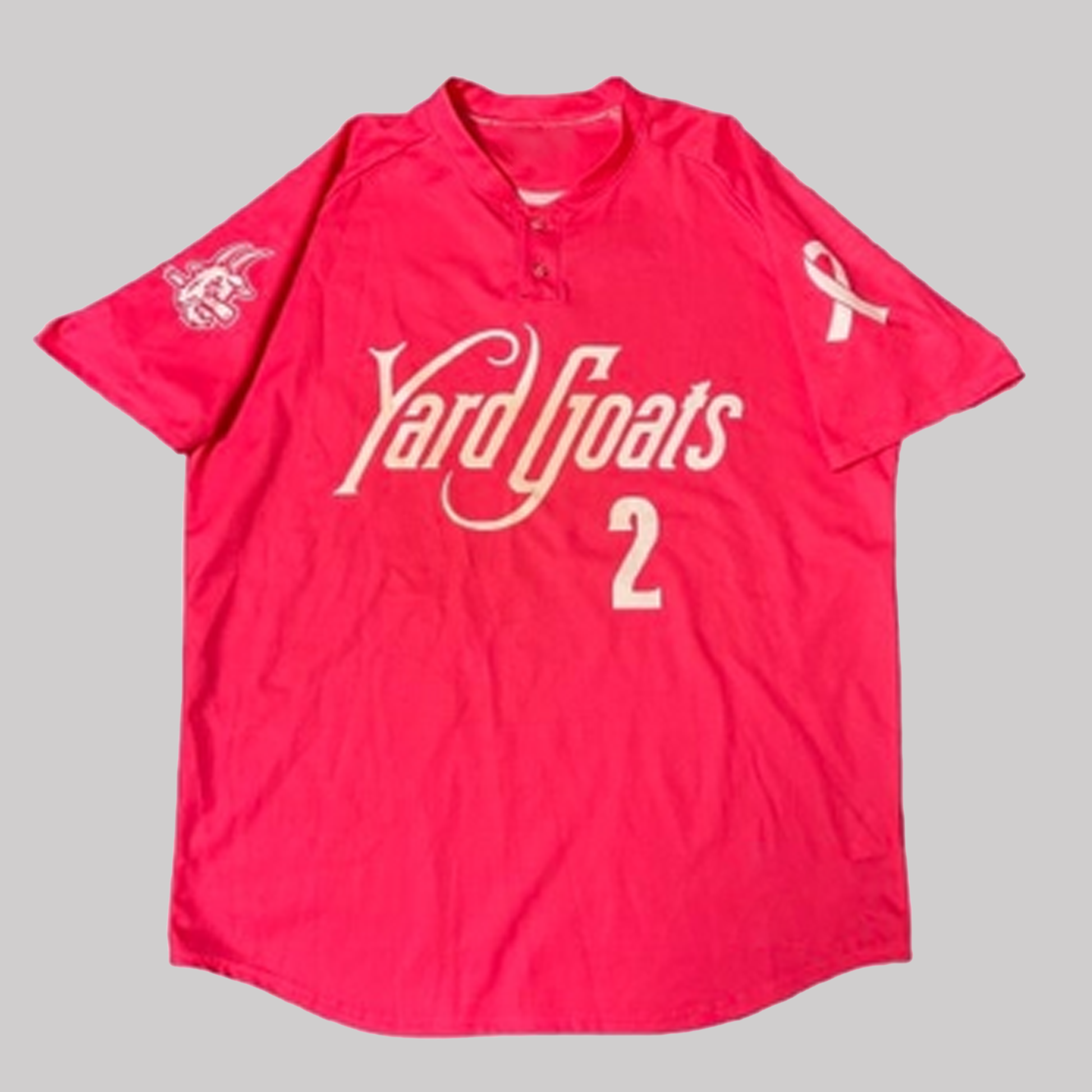 Bold and meaningful design: With the iconic Yard Goats logo on the sleeve and a striking pink ribbon, this jersey makes a statement. The number “2” on the back reflects the same style worn by the team, while the pink ribbon symbolizes the fight against breast cancer.