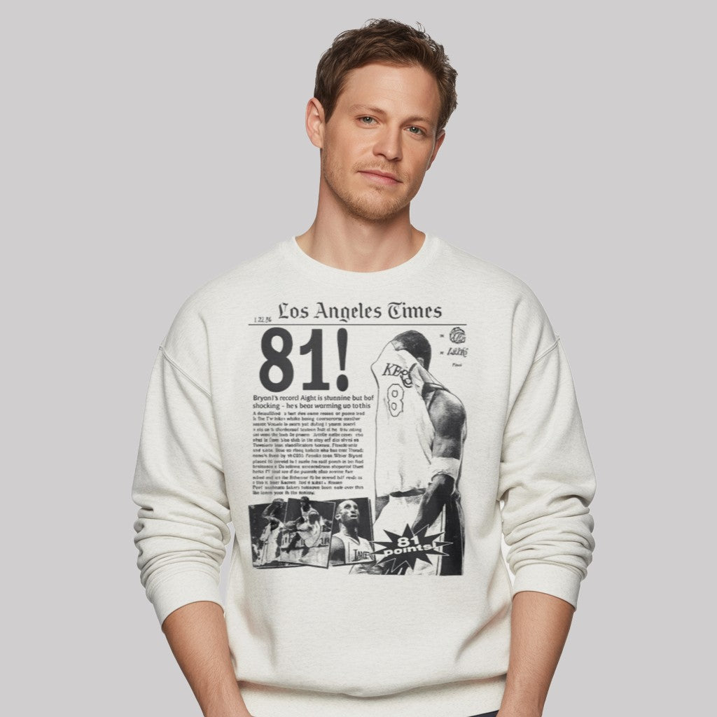 This shirt combines comfort with durability. The detailed print depicts Kobe in his prime, wearing the number 8, along with the unforgettable "81!" that shook the basketball world. The monochromatic, newspaper-style design gives the shirt a unique vintage appeal that sets it apart from the average sports t-shirt.