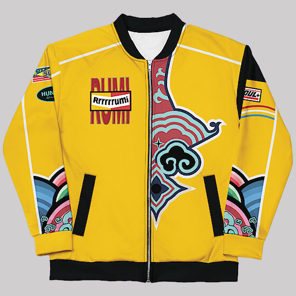 This isn’t just a jacket—it’s a statement of identity and creativity. With its striking yellow base, colorful wave-inspired designs, and eye-catching graphic patches like “RUMI” and “Rrrrrrumi,” it embodies the electrifying visuals often seen in K-pop performances. The asymmetric patterns and bold graphics channel the mystical energy of a demon hunter costume, giving fans a powerful and edgy look while staying true to the stylish, high-fashion roots of Korean pop culture.