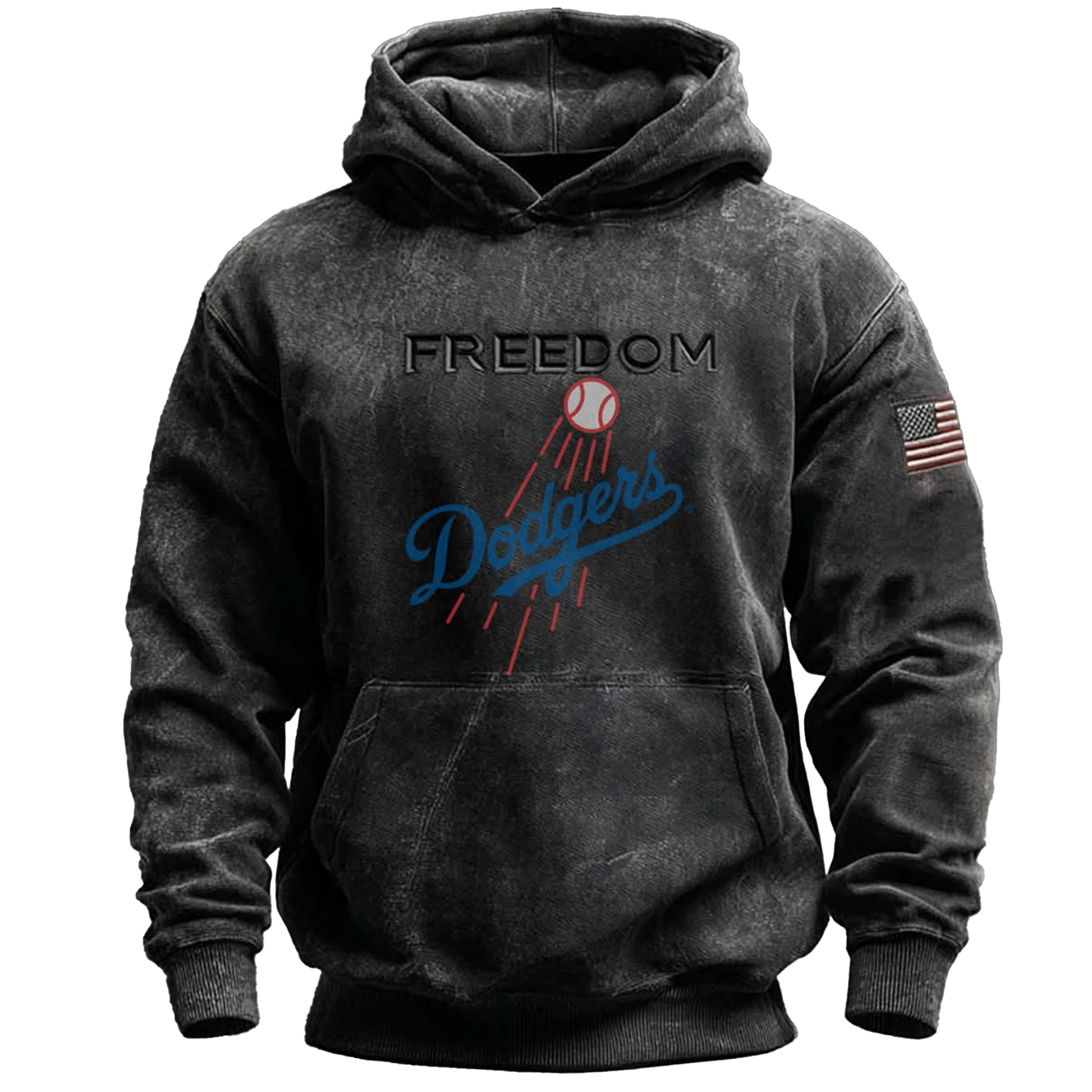 In the center, the word "FREEDOM" is boldly printed above the iconic Dodgers logo, accented with a patriotic red striped baseball motif. The sleeves proudly display an American flag patch, reminding everyone around you that your love for the Dodgers goes hand in hand with your dedication to America.