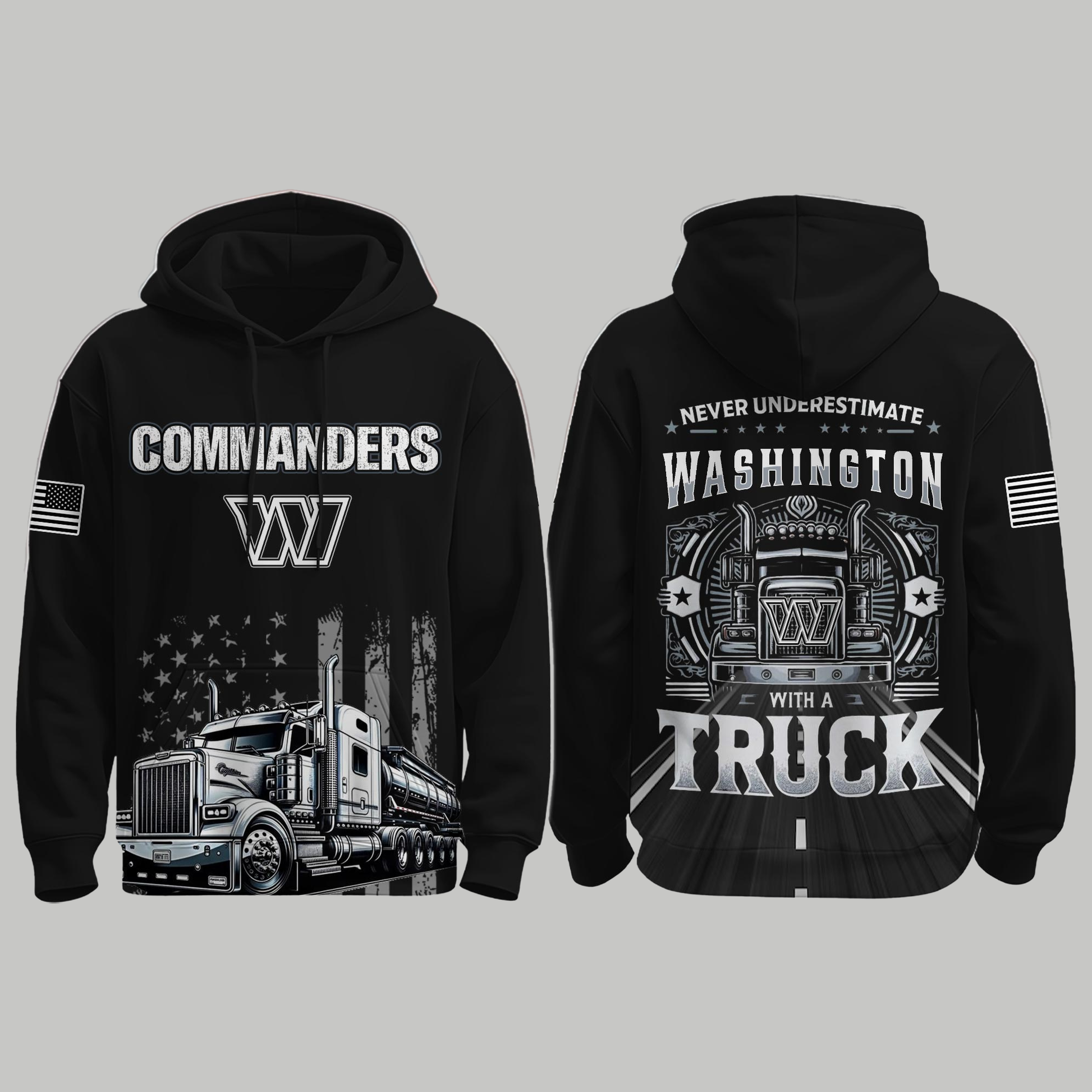 - Meticulously crafted, the hoodie features a striking front design featuring the Commanders logo and a sophisticated chrome tractor-trailer illustration — representing strength, endurance, and dedication. The back proudly proclaims: